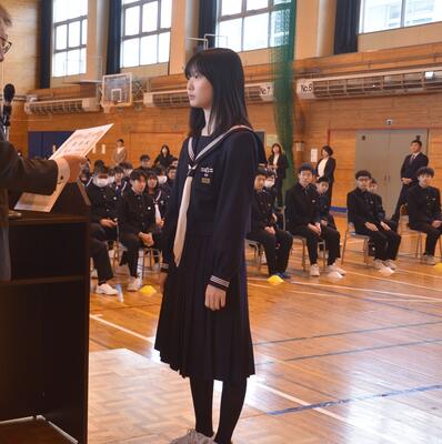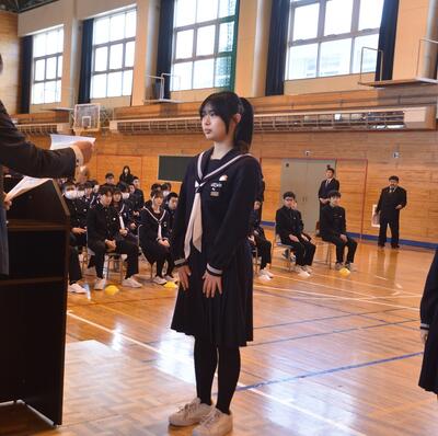 冬休み中も湯中生は大活躍です。冬休み明け集会では、3年生のキリッとした姿が印象的でした。