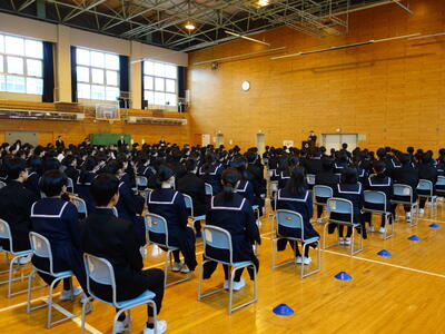 湯中生の元気な挨拶のもと、学校がスタートしました。冬休み明けの集会では、3年生には、体調管理をしっかりして、それぞれの目標に向けて気を緩ませることなく取り組んで欲しいことを、1,2年生には、4月からの次のステージをしっかり意識して、生活して欲しいことなどについて話をしました。また、1人ひとりが「自分を大切にする」「相手の気持ちを考える」「明確な目標を持つ」ことについても、改めてお話をしました。卒業式や修了式までの心の成長が楽しみです。これからも、よろしくお願いいたします。